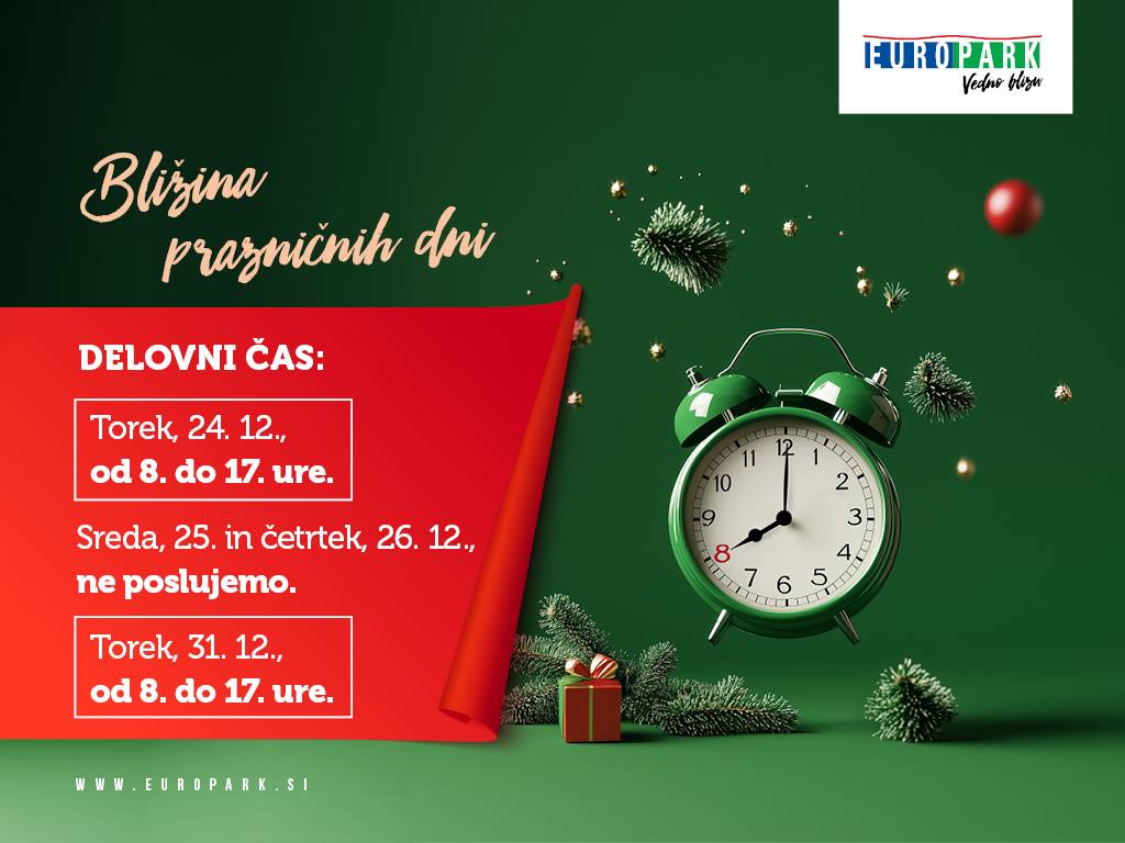 Na božični večer, 24. decembra, in zadnji večer v letu, 31. decembra, bo Europark odprt od 8. do 17. ure, medtem ko na praznična dneva, 25. in 26. decembra, nakupovalna destinacija ne bo poslovala.