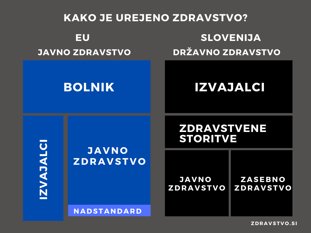 Pri sami ureditvi slovenskega zdravstva napram evropskemu je prikazano, da je v Sloveniji v središču izvajalec, ki dobi denar za opravljanje javnih zdravstvenih storitev. Ker javno zdravstvo v Sloveniji ne morejo izvajati vsi izvajalci, so bolniki zaradi nedostopnosti primorani zdravljenje opraviti v zasebnem zdravstvu.