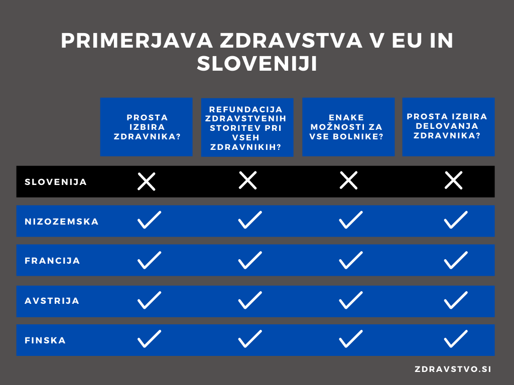 Pri predstavljeni primerjavi zdravstva v Evropski uniji in Sloveniji vidimo, da bolniki v trenutni ureditvi nima možnosti svobodne izbire zdravnika in ne morejo uveljavljati povrnitve stroškov pri katerem koli zdravniku v Sloveniji.