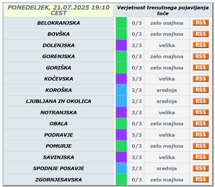 Vijoličasto opozorilo za veliko verjetnost trenutnega pojavljanja toče trenutno velja Dolenjsko, Kočevsko, Notranjsko, Podravje in Savinjsko.