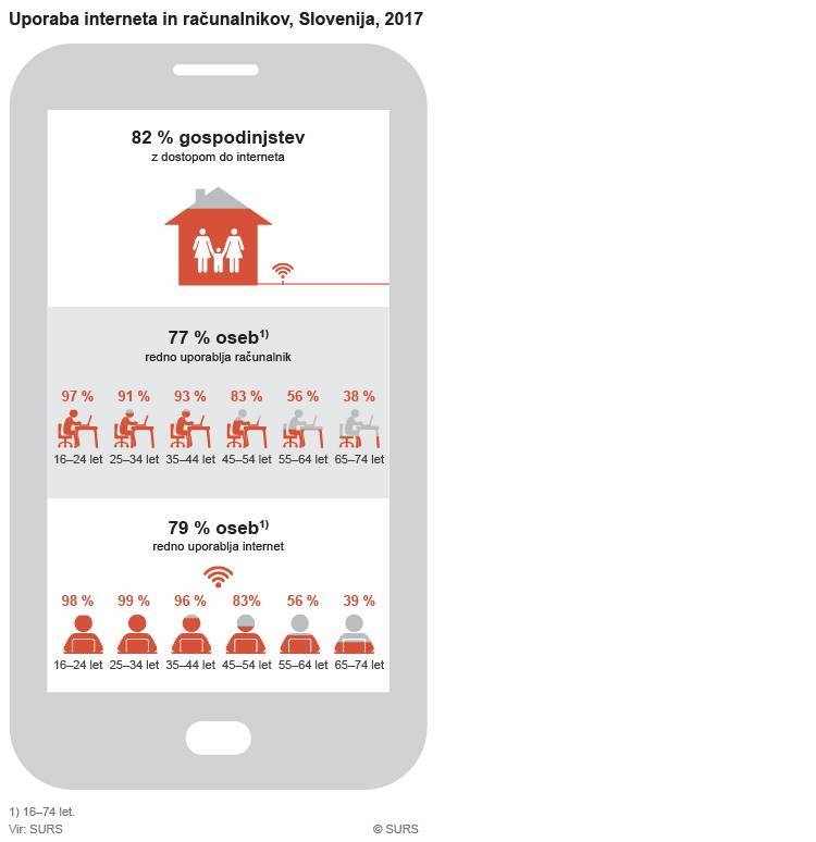 V prvem četrtletju letošnjega leta je bilo po podatkih Statističnega urada Republike Slovenije med osebami, starimi od 16 do 74 let, 79 odstotkov takih, ki so uporabljale internet. 68 odstotkov jih je internet uporabljalo vsak dan ali skoraj vsak dan, 18 odstotkov oseb pa interneta do zdaj še ni uporabljalo.