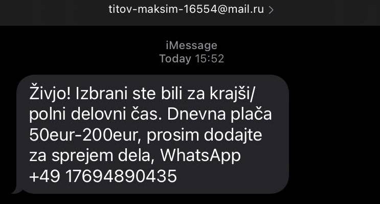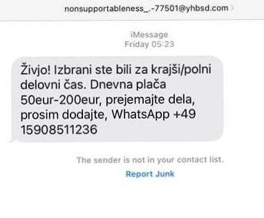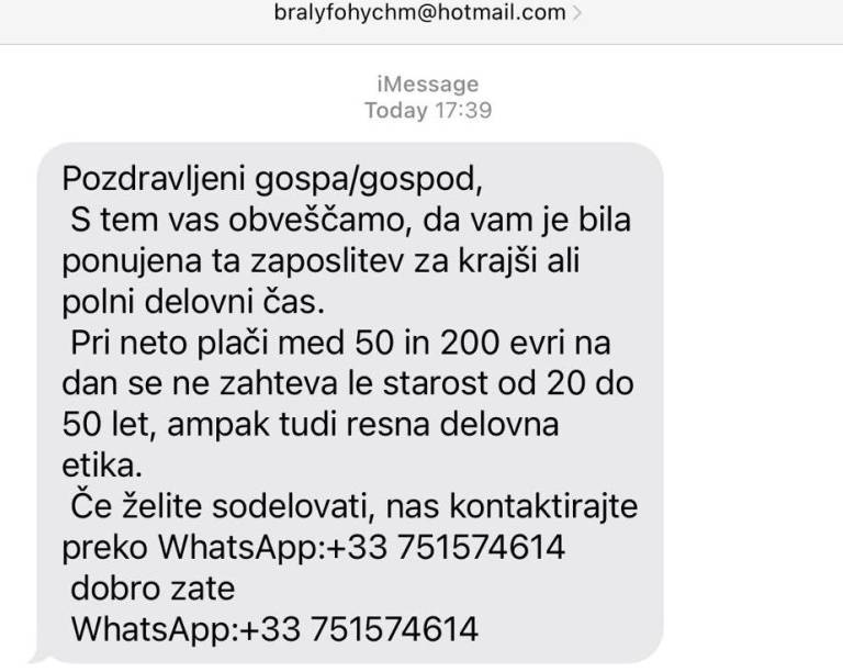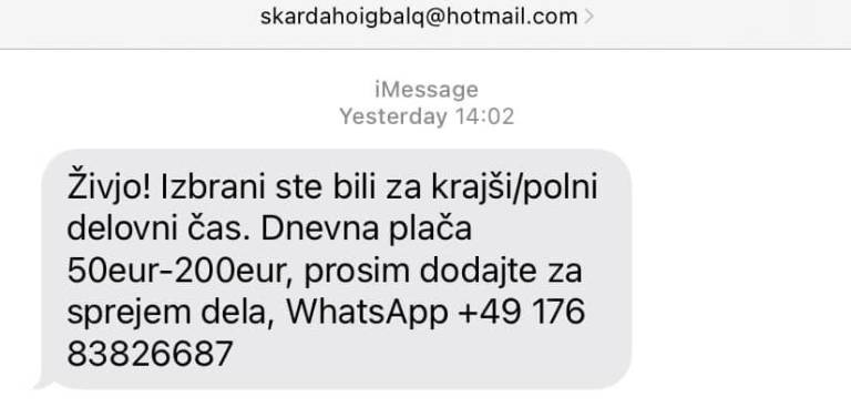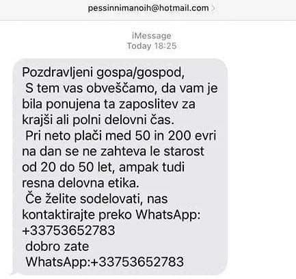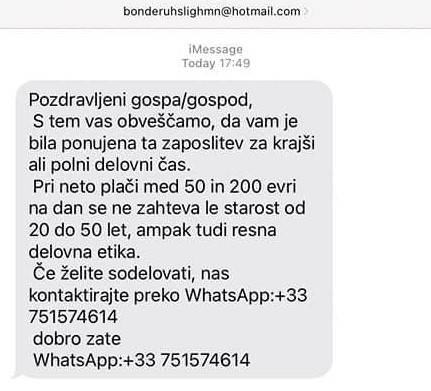 • »Pozdravljeni gospa/gospod. S tem vas obveščamo, da vam je bila ponujena ta zaposlitev za krajši ali polni delovni čas. Pri neto plači med 50 in 200 evri na dan se ne zahteva le starost od 20 do 50 let, ampak tudi resna delovna etika. Če želite sodelovati, nas kontaktirajte preko WhatsApp.«