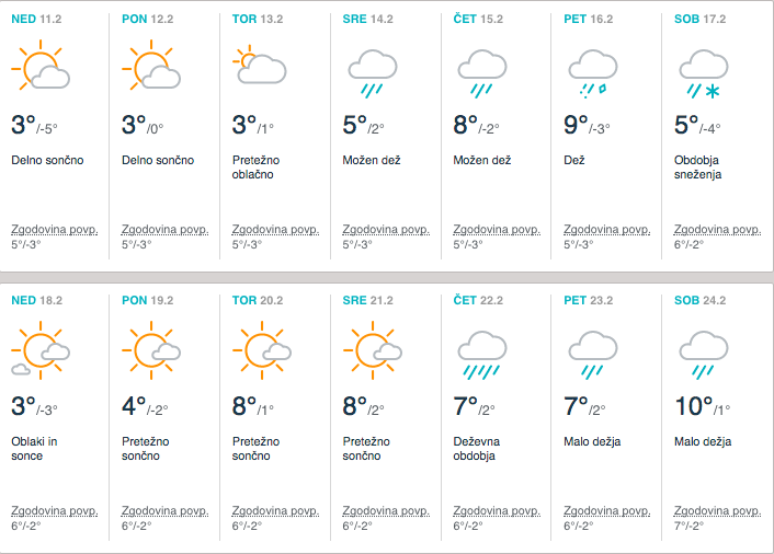 Meteorologi so glede napovedi za februar še razmeroma skopi. Temperature bodo nižje od januarskih, a vendar ljubitelji zime in snega v nižinah ne bodo prišli na svoj račun. Dolgoročne vremenske napovedi na spletnem portalu Accuweather kažejo, da se bodo temperature zraka v severovzhodni Sloveniji pod ledišče spustile ponoči in ob jutrih, medtem ko bodo dnevne temperature praviloma nad lediščem.