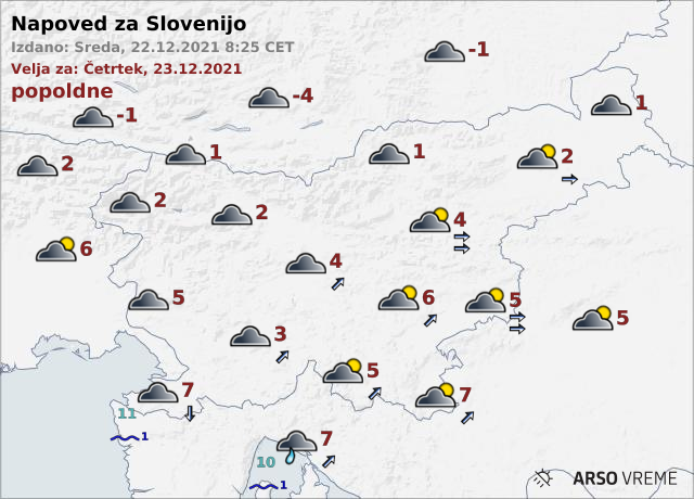 Najnižje jutranje temperature bodo v alpskih dolinah okoli -11, drugod od minus osem do minus dve, ob morju okoli dve stopnji Celzija, najvišje dnevne temperature pa bodo od ena do sedem stopinj Celzija.