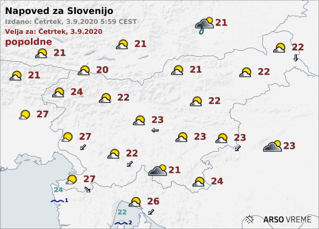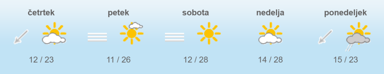 Sprva bo zmerno do pretežno oblačno, tu in tam lahko pade kakšna kaplja dežja. Na Primorskem bo pihala šibka burja. Popoldne se bo od severozahoda postopno jasnilo. Najvišje dnevne temperature bodo od 20 do 24, na Goriškem in ob morju okoli 27 stopinj Celzija.