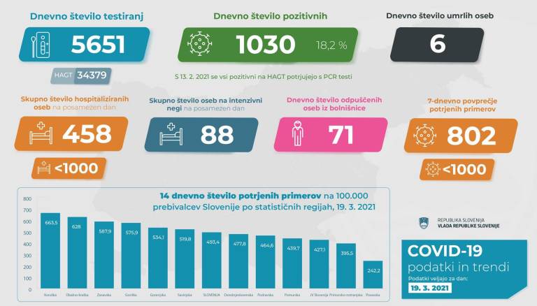 V Sloveniji so včeraj, 19. marca, opravili 5651 PCR testiranj na koronavirus in potrdili 1030 novih okužb, gre za 18,2-odstotni delež okužb.