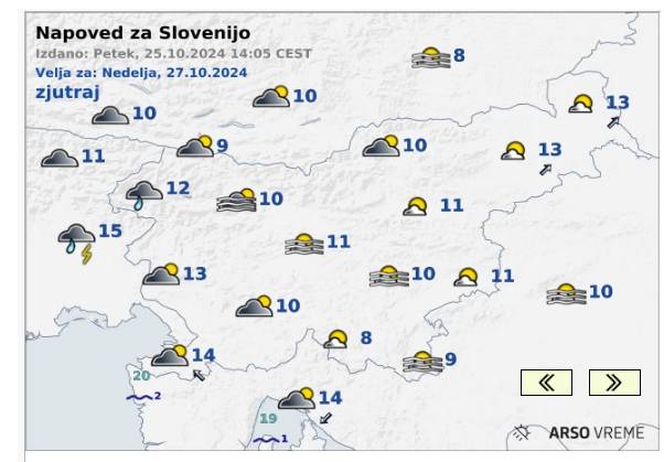 Jutri bo v vzhodni in osrednji Sloveniji povečini sončno in po nižinah sprva megleno. Na zahodu bo zmerno do pretežno oblačno. Ponekod bo pihal jugozahodni veter. Najnižje jutranje temperature bodo od 9 do 14, najvišje dnevne od 17 do 22 stopinj Celzija.