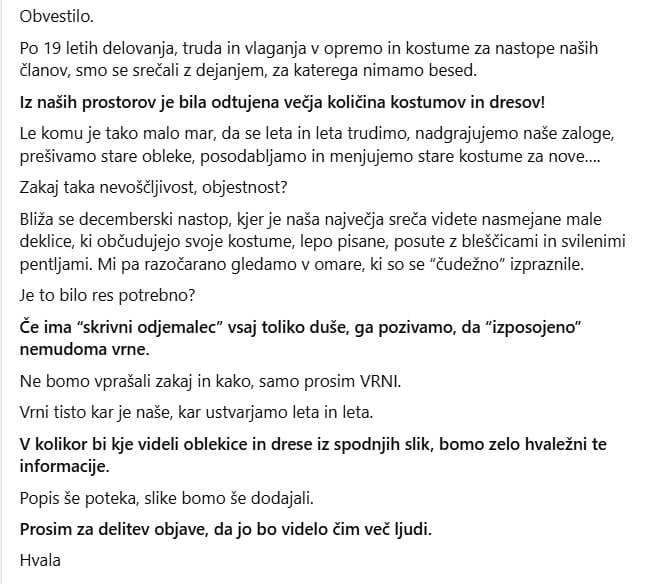 Nekdo jim je ukradel večjo količino kostumov in dresov. V društvu poudarjajo pomen teh kostumov za njihove nastope, še posebej za decembrski dogodek, kjer mali baletniki z veseljem občudujejo barvite in bleščeče obleke.