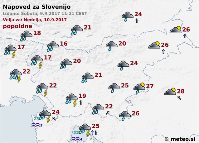 Deževalo bo pogosteje kot danes, občasno lahko za krajši čas tudi v vzhodnih krajih. Predvsem na Primorskem bodo vmes posamezne nevihte. Najvišje dnevne temperature bodo od 16 do 22, v vzhodnih krajih in ob morju od 24 do 27 stopinj Celzija.