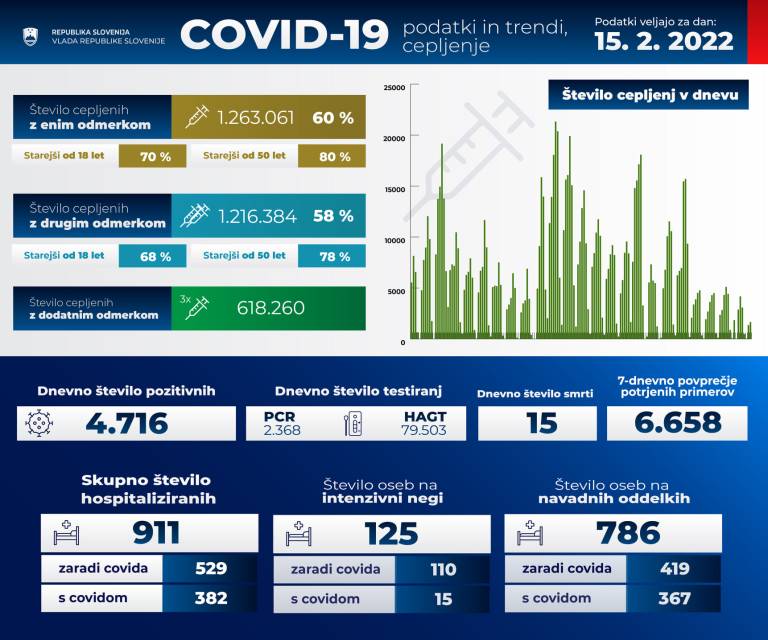 Po zadnjih podatkih je zaradi covida hospitaliziranih 529 bolnikov, s covidom oziroma drugih bolezni pa 382 bolnikov.