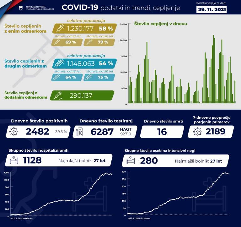 Trenutno je po podatkih Covid-19 Sledilnika v bolnišnicah hospitaliziranih 1128 covidnih bolnikov, od tega je 280 pacientov na intenzivni negi.