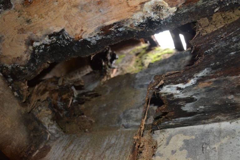 Vendar pa - kot smo omenili - predstavlja največjo nevarnost prav streha, ki ne le, da prepušča vodo in tako teče v notranjost, grozi tudi, da se bo porušila in zasula Ernesta, če bo v tistem trenutku v hiši.