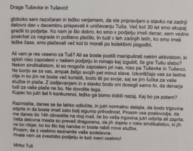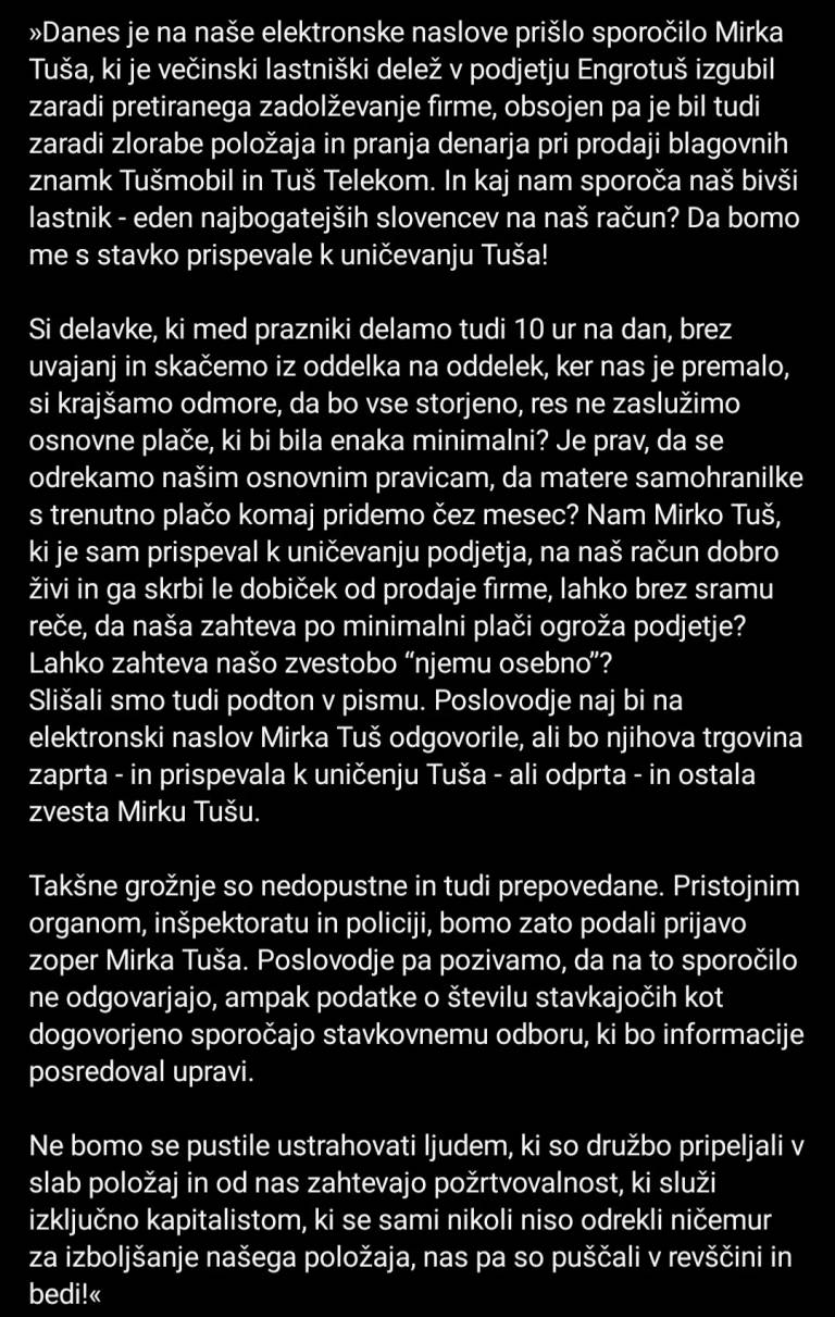 Ustanovitelj Engrotuša in še vedno eden od lastnikov Mirko Tuš je zaposlenim pred napovedano stavko poslal elektronsko sporočilo, v katerem je med drugim zapisal, da je globoko razočaran nad stavko, ker bi ta uničila podjetje. V sporočilu se je vprašal, ali je res vsem zaposlenim vseeno za Tuš, sindikat pa je obtožil, da izkorišča delavce.