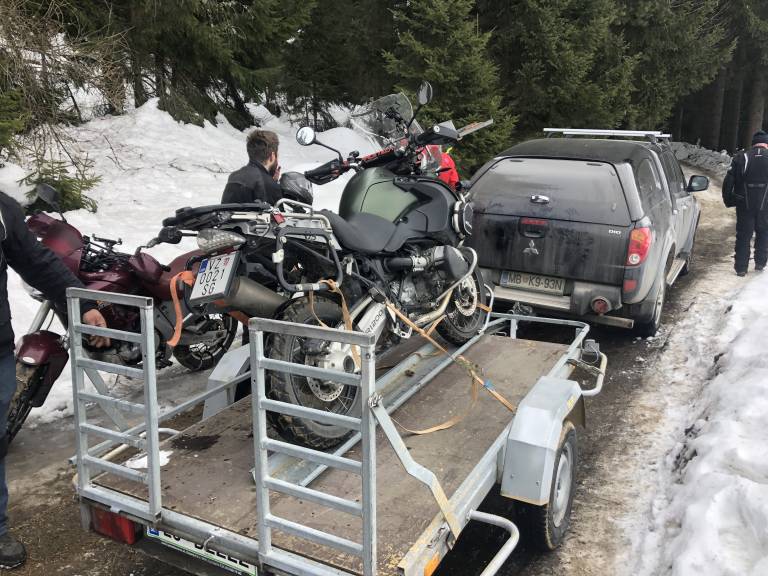 Tiste, ki jim ni uspelo prilezti do prizorišča z motorjem, so organizatorji prepeljali s terenskim vozilom in prikolico za prevoz motorjev.