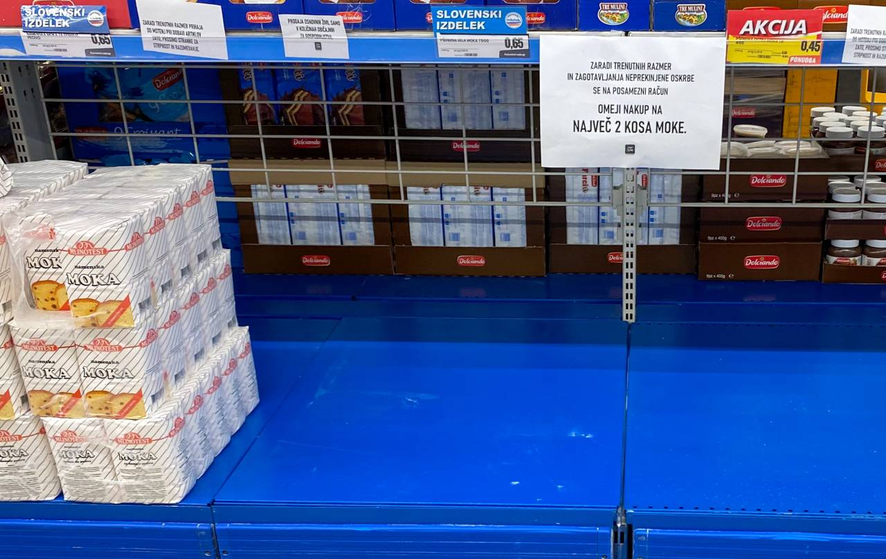 Kot smo že poročali, trgovci svarijo, da panika in nakupovanje na zalogo nista potrebna. Zaradi povečanega povpraševanja po olju in moki pa v nekaterih trgovinah prihaja do težav v dobavi, posledica so skoraj prazne trgovinske police.