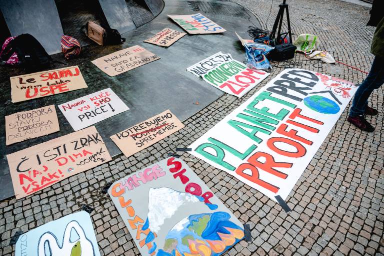 »Obljube razne, še vedno prazne!« opozarjajo protestniki na 'podnebnem štrajku'. Od vlade zahtevajo, da po lepih besedah in obljubah preidejo k dejanjem.