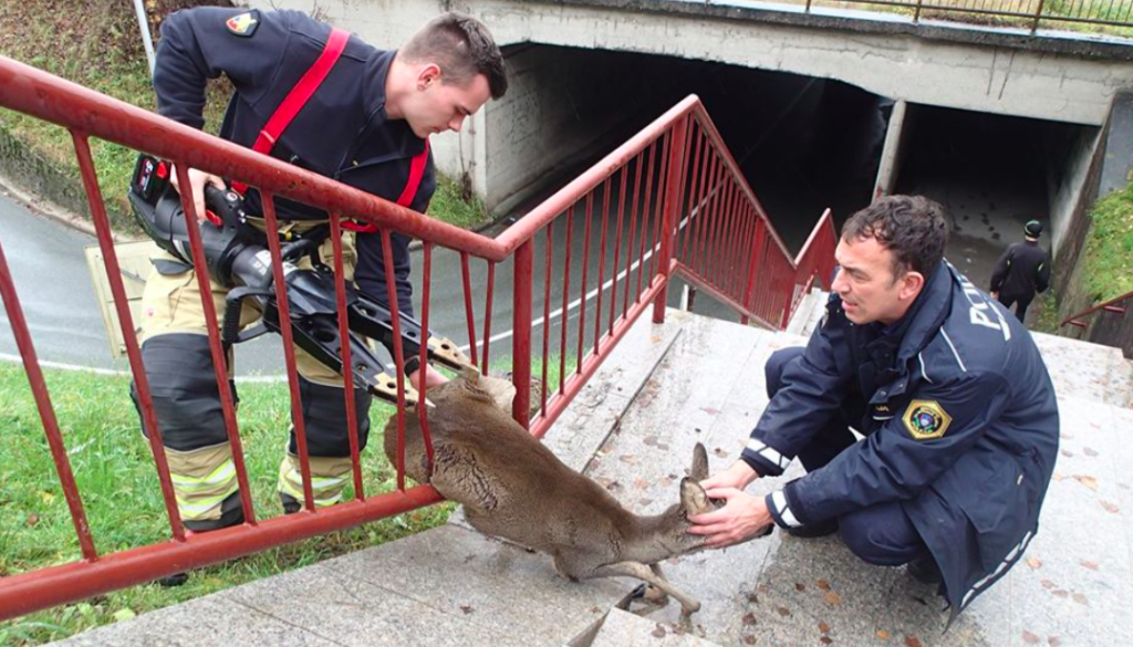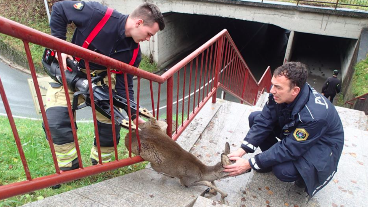 FOTO: Policisti in gasilci rešili srnico, ki se je ujela v ograjo