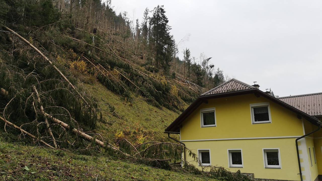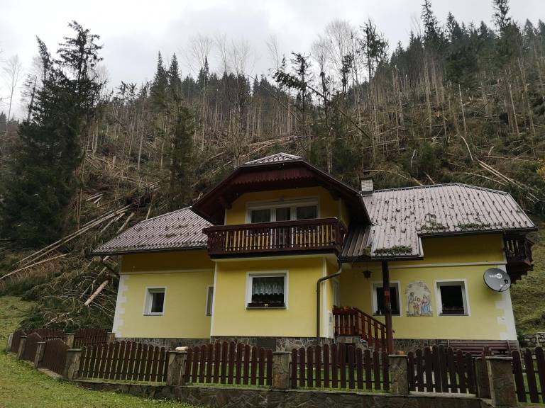 V Koprivni v občini Črna na Koroškem je orkanski veter podiral brez milosti. Že šesti dan zapovrstjo se trudijo, da bi vsaj delno izbrisali sledi, ki jih je za seboj pustila ujma. Ponekod še vedno ni elektrike. Stanje je nepopisno. Drevesa ležijo kot padle domine. Najhuje je pri kmetiji Jurija Fortina, ki jim po domače pravijo Potočnikovi. Solz v očeh ne more skriti.