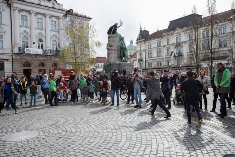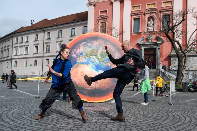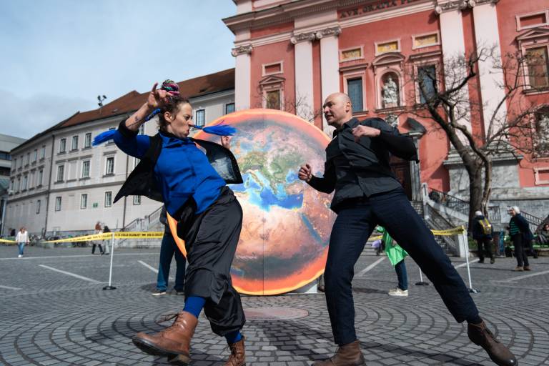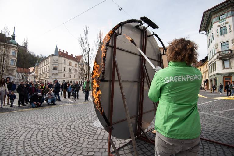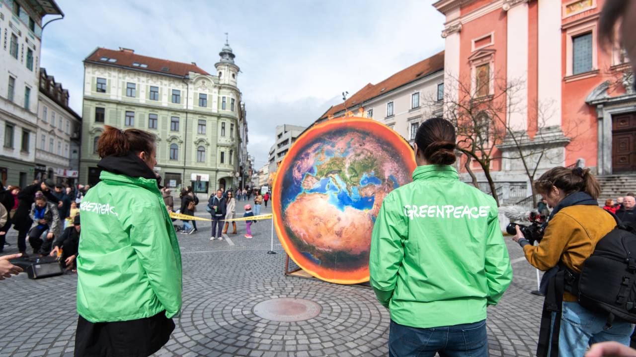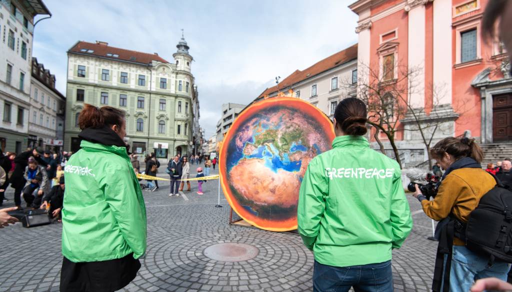 Greenpeaceovi aktivisti so danes, v soboto, 1. aprila, ob 10.30 v centru Ljubljane na Prešernovem trgu izvedli intervencijo 'Zemlja gori'’.