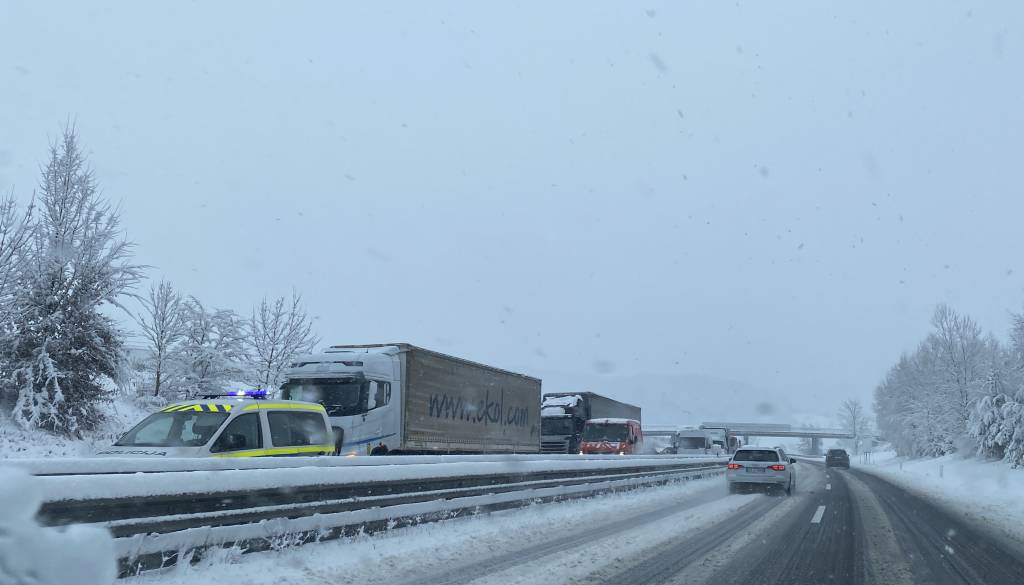 Pozor! Po večjem delu Slovenije sneži, promet je upočasnjen, ponekod nastajajo daljši zastoji. Prilagodite hitrost in varnostno razdaljo ter upoštevajte, da boste za pot potrebovali več časa kot običajno.