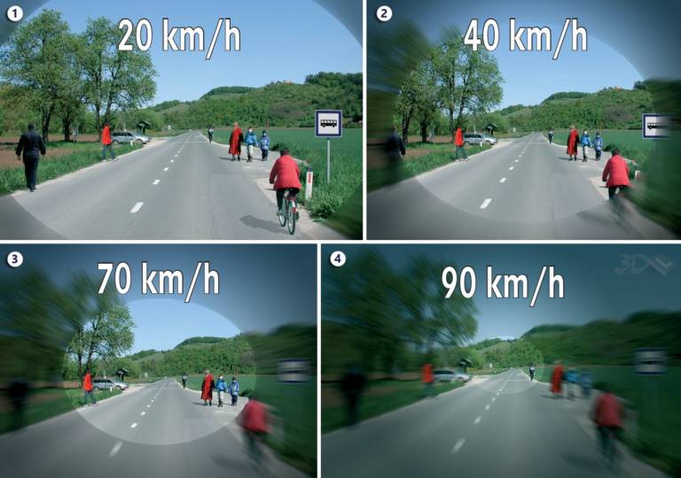 Med vožnjo moramo zaznati čim več podrobnosti na cesti in okrog nje. S povečanjem hitrosti se voznikovo vidno polje zožuje – to privede do t. i. tunelskega vida.
