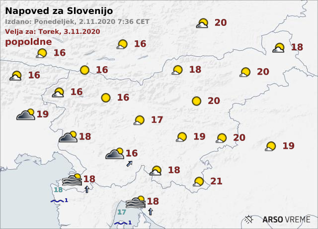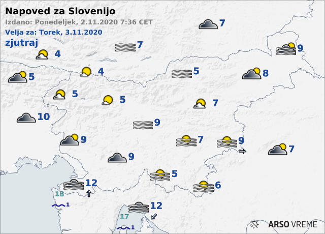 Dopoldne bo po nižinah megla ali nizka oblačnost, ki se bo predvsem na Primorskem zadrževala večji del dneva. Najnižje jutranje temperature bodo danes od 4 do 9, na Primorskem okoli 11 stopinj Celzija, najvišje dnevne temperature pa bodo od 16 do 21 stopinj Celzija.