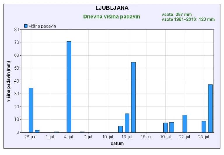 Kot je razvidno iz primerjave med lanskim in letošnjim letom, smo imeli lani v celem juliju v skupnem seštevku kar polovico manj padavin kot pa letos.