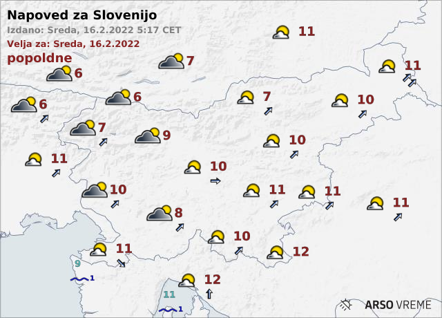 Zjutraj in dopoldne bo marsikje po nižinah megla, popoldne bo zapihal jugozahodni veter, najvišje dnevne temperature pa bodo pri tem od 6 do 12 stopinj Celzija.