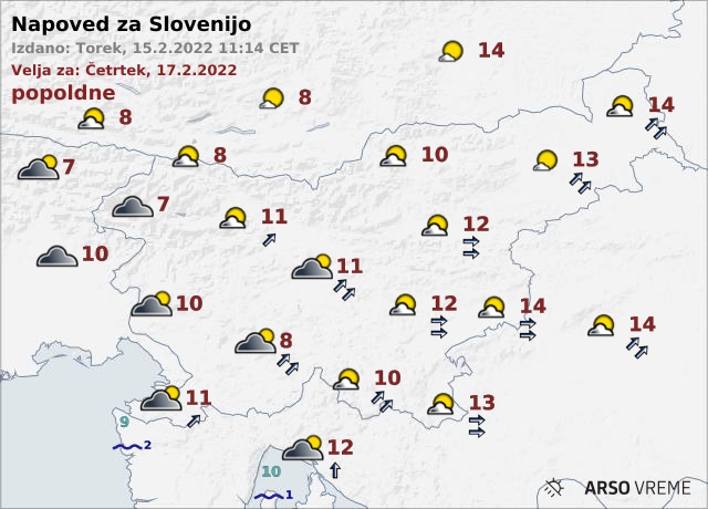 Jutri bo na zahodu pretežno oblačno, drugod deloma jasno, pihal bo okrepljen jugozahodni veter. Jutranje temperature bodo od ena do pet, v severnih krajih malo pod ničlo, najvišje dnevne pa od sedem do 14 stopinj Celzija.