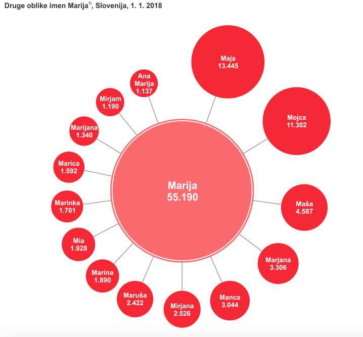 Marija je najpogostejše žensko ime v vsaki statistični regiji Slovenije in je bilo najbolj pogosto dodeljeno žensko ime do leta 1969.