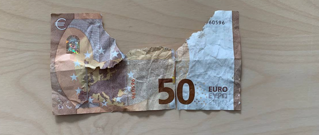 Rešitev je pravzaprav zelo preprosta. Banka Slovenije se ukvarja z zamenjavo poškodovanih evrobankovcev. Zamenjali vam bodo poškodovan bankovec, če predložite več kot polovico bankovca ali dokažete, da je bil manjkajoči (večji) del uničen.