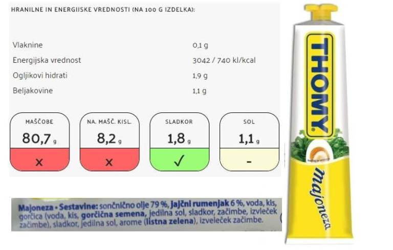 Zveza potrošnikov Slovenije razliko pojasnjuje na zanimivem primeru – čeprav na polici v trgovini oba izdelka izgledata podobna, oba sta pakirana v tubi in imata v imenu majonezo, pa standardu za majonezo ustreza prvi izdelek, ki glede na seznam sestavin vsebuje 79 odstotkov sončničnega olja in 6 odstotkov jajčnega rumenjaka. Drugi izdelek vsebuje le 66 odstotkov maščobe in le 0,5 odstotka jajc.