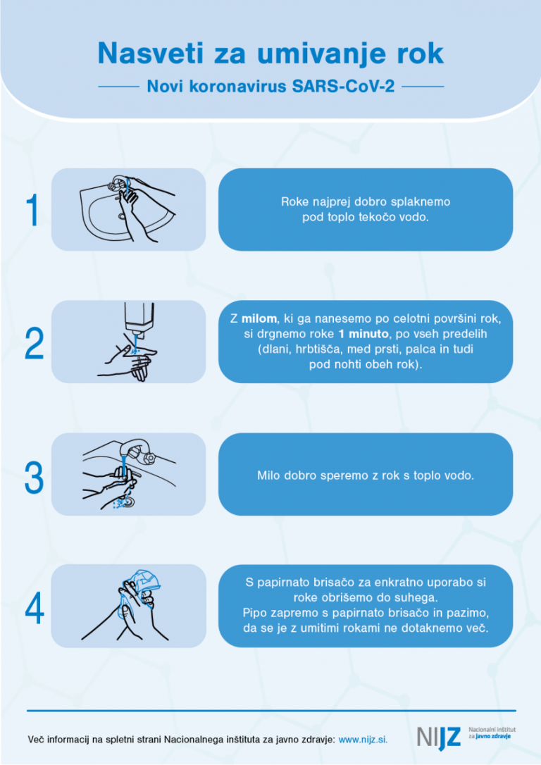 Pri preprečevanju okužbe z virusom SARS-CoV-2 je tako kot pri drugih nalezljivih bolezni, ki povzročajo okužbe dihal, priporočljivo upoštevati vsakodnevne preventivne ukrepe. Kateri so ti ukrepi, pojasnjujejo na Nacionalnem inštitutu za javno zdravje.
