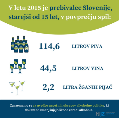 Na Nacionalnem inštitutu za javno zdravje ugotavljajo, da se je v letu 2015 registrirana poraba alkohola v primerjavi z letom poprej znova zvišala in je znašala 11,5 litra čistega alkohola na vsakega prebivalca Slovenije, starejšega od 15 let.