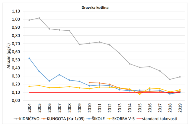 Atrazin se je pred letom 2002 uporabljal v velikih količinah, saj je bil zelo učinkovito sredstvo za uničevanje plevela. V preteklosti so bila z atrazinom obremenjena praktično vsa merilna mesta na Dravski kotlini, po prepovedi uporabe v letu 2003 pa je začelo upadati število obremenjenih merilnih mest. Še vedno predstavlja problem prisotnost atrazina na nekaterih črpališčih pitne vode, predvsem črpališču Skorba in Šikole.