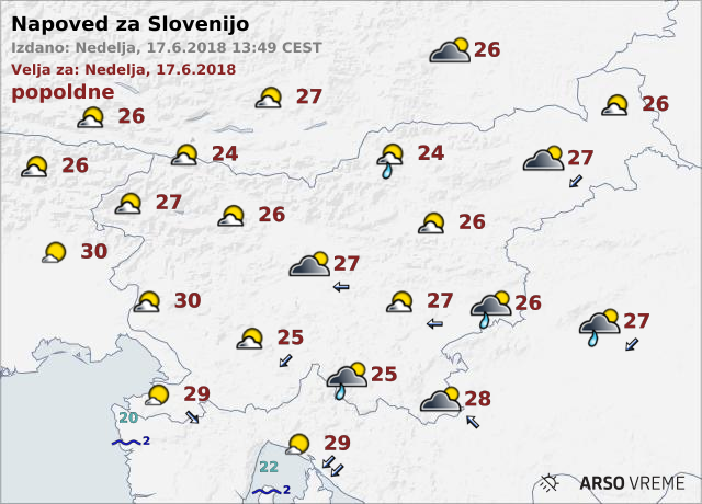 Tako pa bomo vstopili tudi v pričetek tedna. Jutri bo sprva precej jasno, a se bo čez dan pojavila občasna spremenljiva oblačnost, napoveduje Agencija RS za okolje. V popoldanskem času bo lahko v vzhodni polovici Slovenije nastala tudi kakšna kratkotrajna ploha, lahko pa tudi zagrmi. Pihal bo severni do jugovzhodni veter. Najnižje jutranje temperature bodo od 11 do 17, najvišje dnevne pa od 24 do 28 stopinj Celzija.