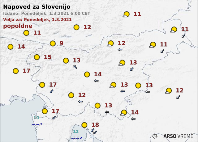 V torek bo pretežno jasno, ponekod v notranjosti bo zjutraj nekaj megle ali pa nizke oblačnosti. Burja na Primorskem bo čez dan ponehala. Najnižje jutranje temperature bodo od -5 do 1, na Primorskem okoli 3, najvišje dnevne od 11 do 15, na Primorskem do 17 stopinj Celzija.