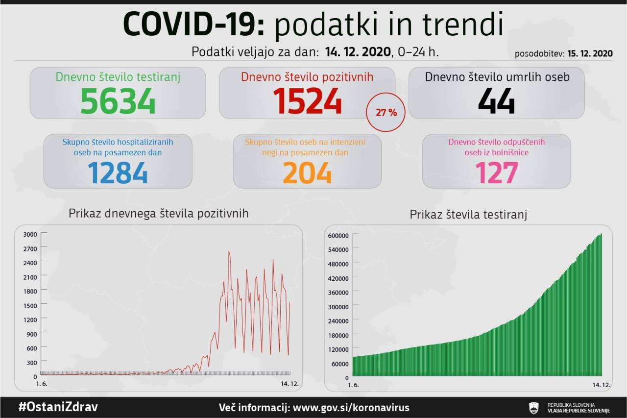 V Sloveniji so v včeraj, 14. decembra, opravili 5634 testiranj na koronavirus in potrdili 1524 novih okužb. To pomeni, da je bil delež pozitivnih testov tokrat 27,05-odstoten.