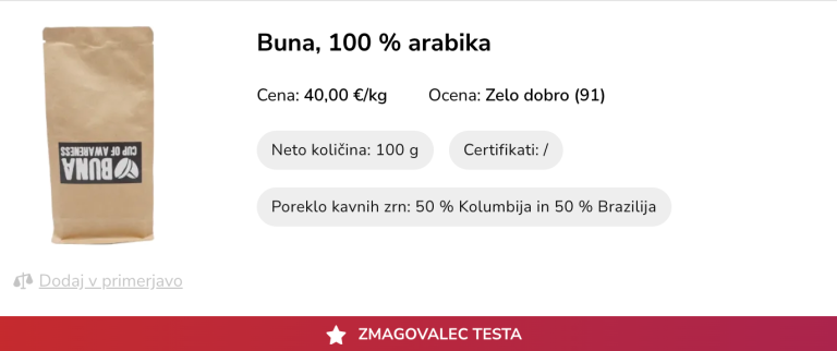 Na testu so pri Zvezi potrošnikov Slovenije preverili 14 kav. Parametri, ki so vplivali na končno oceno, so bili naslednji: izmerjena vsebnost škodljivega ohratoksina A in akrilamida, senzorična analiza, označevanje in trajnostne oznake.