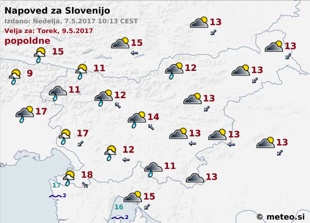 Vremenoslovci danes napovedujejo spremenljiv do pretežno oblačen dan, popoldne pa bodo nastajale krajevne plohe. Najvišje dnevne temperature bodo od 15 do 21 stopinj Celzija.