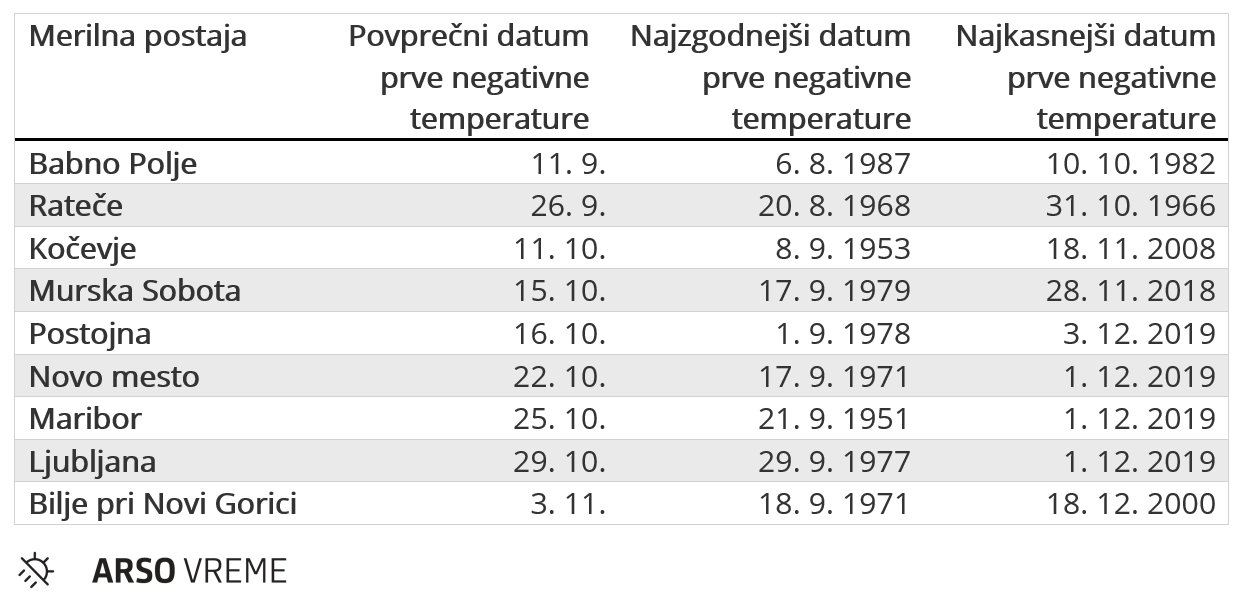 Septembrski »minus« je vsaj v večjem delu Slovenije vedno redkejši, zadnja leta je opazen trend pomikanja prve negativne temperature proti sredini ali koncu novembra, zlasti to velja za mestna središča.