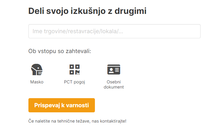 Na spletnem portalu je za deljenje izkušnje v obratu potrebno zapisati in izbrati določen obrat in označiti, ali je ob vstopu zahtevana zaščitna maska.