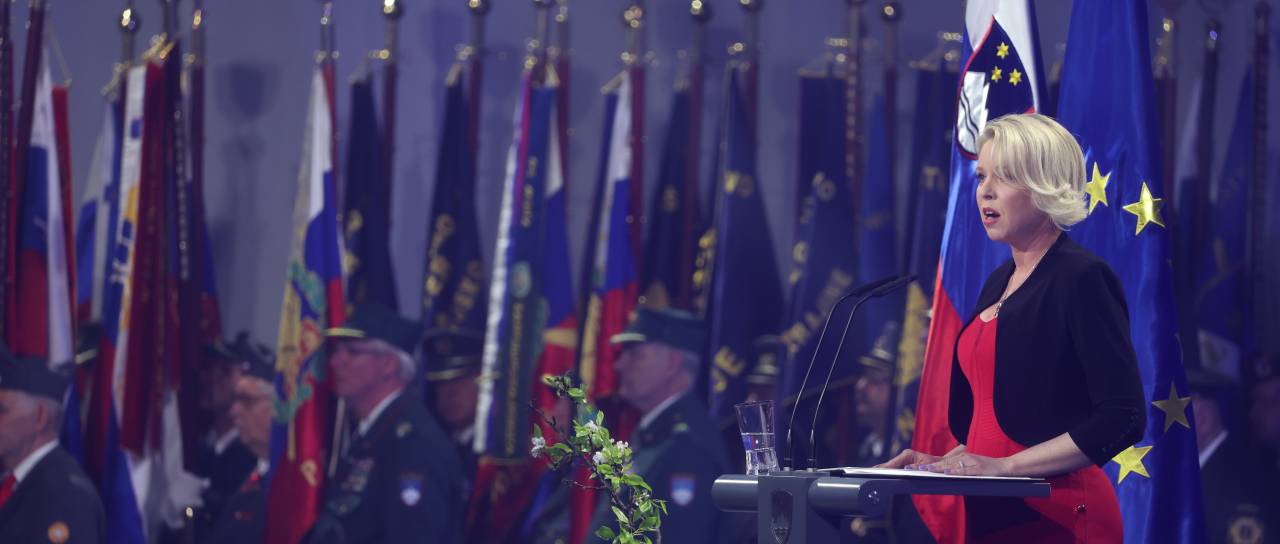 Meni, da nas lastna zgodovina venomer opominja na potrebno budnost. »Ne smemo se slepiti, da se zgodovina ne more ponoviti, saj prav danes nedaleč od nas ječijo razgrete topovske cevi, ki neusmiljeno poustvarjajo že videne strahote,« je dejala in poudarila, da Slovenke in Slovenci nismo več majhen, nepomemben narod nekje na sredini konfliktov velikih sil. Smo slišani in toliko pomembni, kolikor smo jasni v svojih stališčih in prizadevanjih na diplomatskih parketih po svetu, meni.