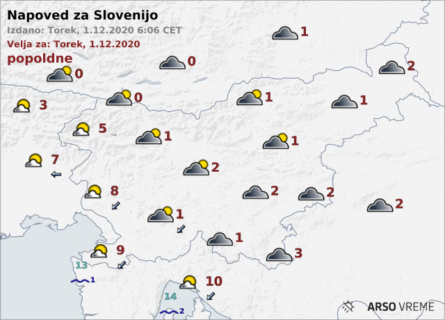 Jutri bo oblačno. Zjutraj in dopoldne se bodo na jugu začele pojavljati rahle padavine, ki se bodo popoldne nekoliko okrepile in razširile nad večji del Slovenije. Po nižinah Primorske bo deževalo, drugod pa snežilo. Najvišje dnevne temperature bodo od minus tri do minus ena, na Primorskem okoli pet stopinj Celzija.