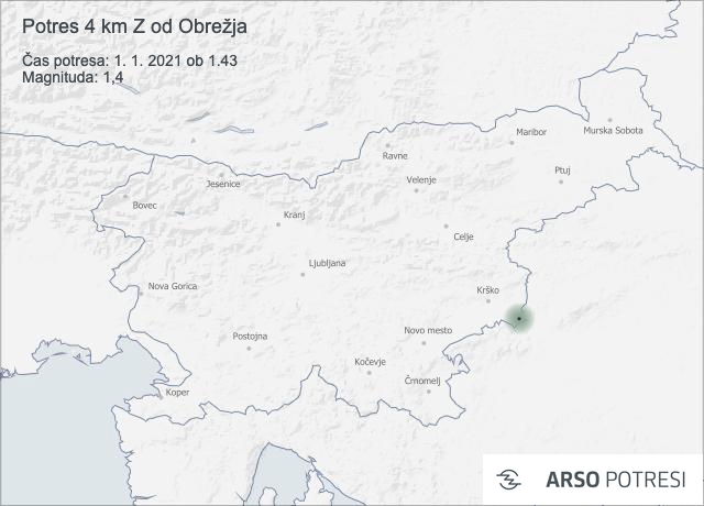 Uprava Republike Slovenije za zaščito inreševanje poroča, da so seizmografi državne mreže potresnih opazovalnic ob 1.43 in ob 2.00 zabeležili potresa magnitude 1,4 in 1,3 v bližini Brežic, 85 kilometrov vzhodno od Ljubljane.