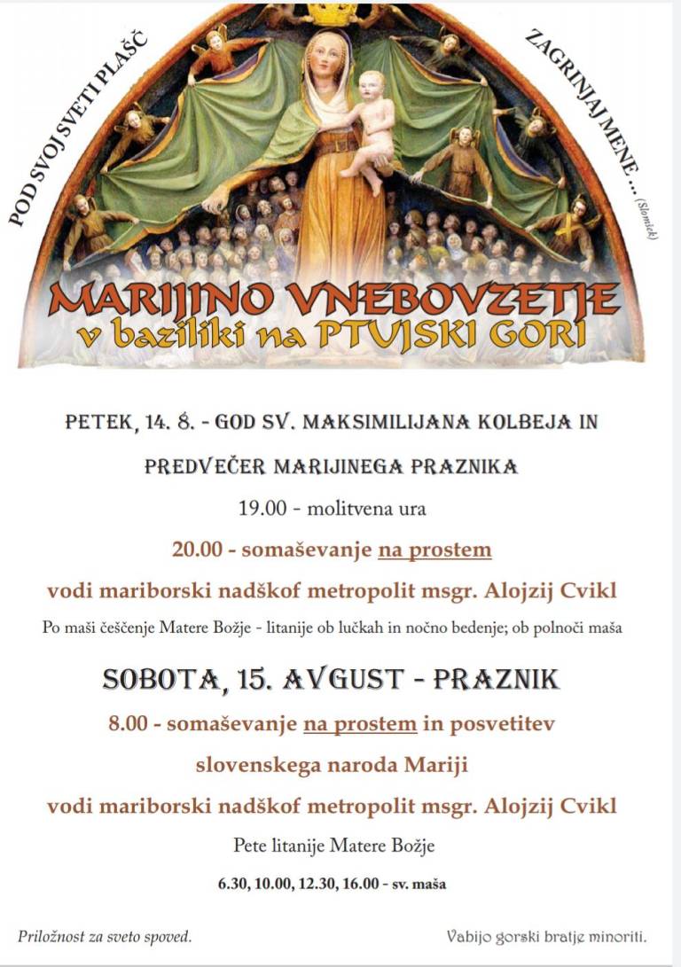 Ptujskogorski bratje minoriti tudi letos vabijo k praznovanju Marijinega vnebovzetja v baziliko na Ptujski Gori. Vendar pa bo to zaradi ukrepov za zajezitev širjenja koronavirusa letos nekoliko drugačno kot v preteklih letih.