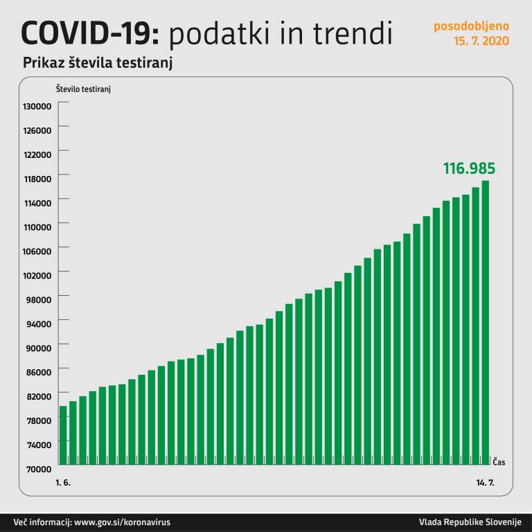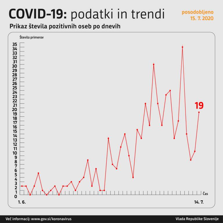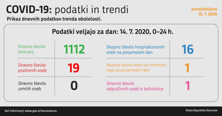 Število novih okužb s koronavirusom v Sloveniji spet krepko poskočilo. Včeraj, 14. julija, so v Sloveniji izvedli 1112 testiranj na novih koronavirus. Z njimi so potrdili 19 novih okužb. Za primerjavo: dan poprej je bilo novih okužb deset.