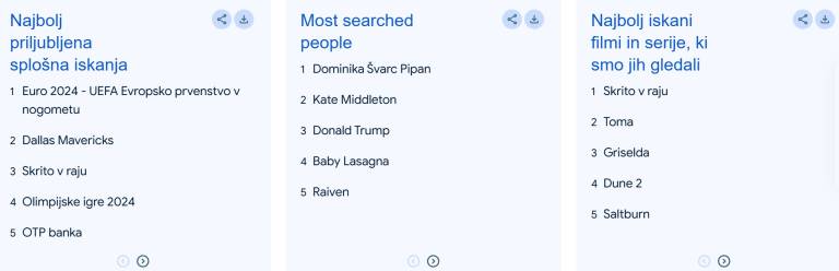 Slovenci so letos na spletu najpogosteje iskali informacije o evropskem prvenstvu v nogometu oziroma Euru 2024. Na drugo mesto se je uvrstil ameriški košarkarski klub Dallas Mavericks, za katerega igra slovenski zvezdnik Luka Dončić, na tretje pa slovenska serija Skrito v raju.