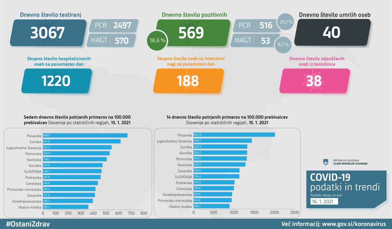V Sloveniji so včeraj, 16. januarja, opravili 3067 testiranj na koronavirus in potrdili 569 novih okužb, gre za 18,6-odstotni delež.