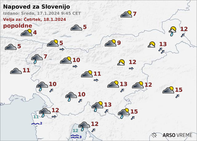 Dopoldne bodo padavine postopno ponehale, razen na zahodu se bo prehodno delno razjasnilo. Najvišje dnevne temperature bodo od devet do 15, na severozahodu okoli pet stopinj Celzija.